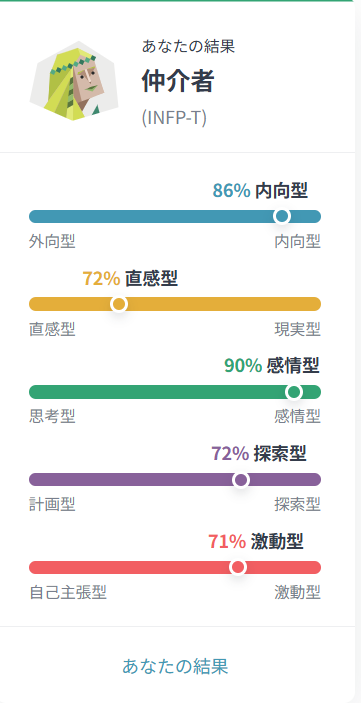 私も実際に診断を何度か何度かテストを受けてみましたが、何度しても結果は「INFP(仲介者)」でした。生粋のINFPなみたいです・・・。