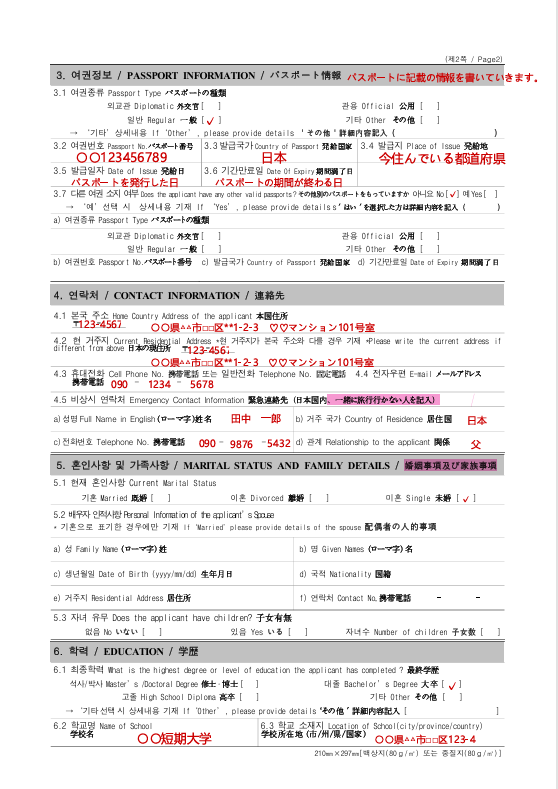 2枚目は主にパスポートや、緊急連絡債、学歴について記入をしていきます。