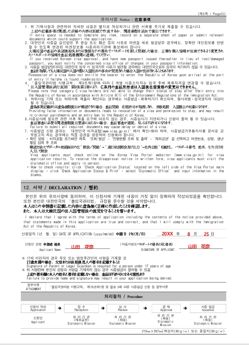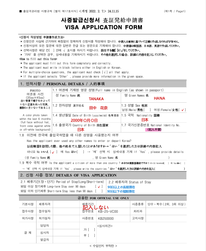 この書類は自分自身に関する基本的な情報(氏名・生年月日・国籍・パスポート情報など)や、韓国での滞在目的などを韓国の領事館に伝えるための公式な申込書のようなものです。